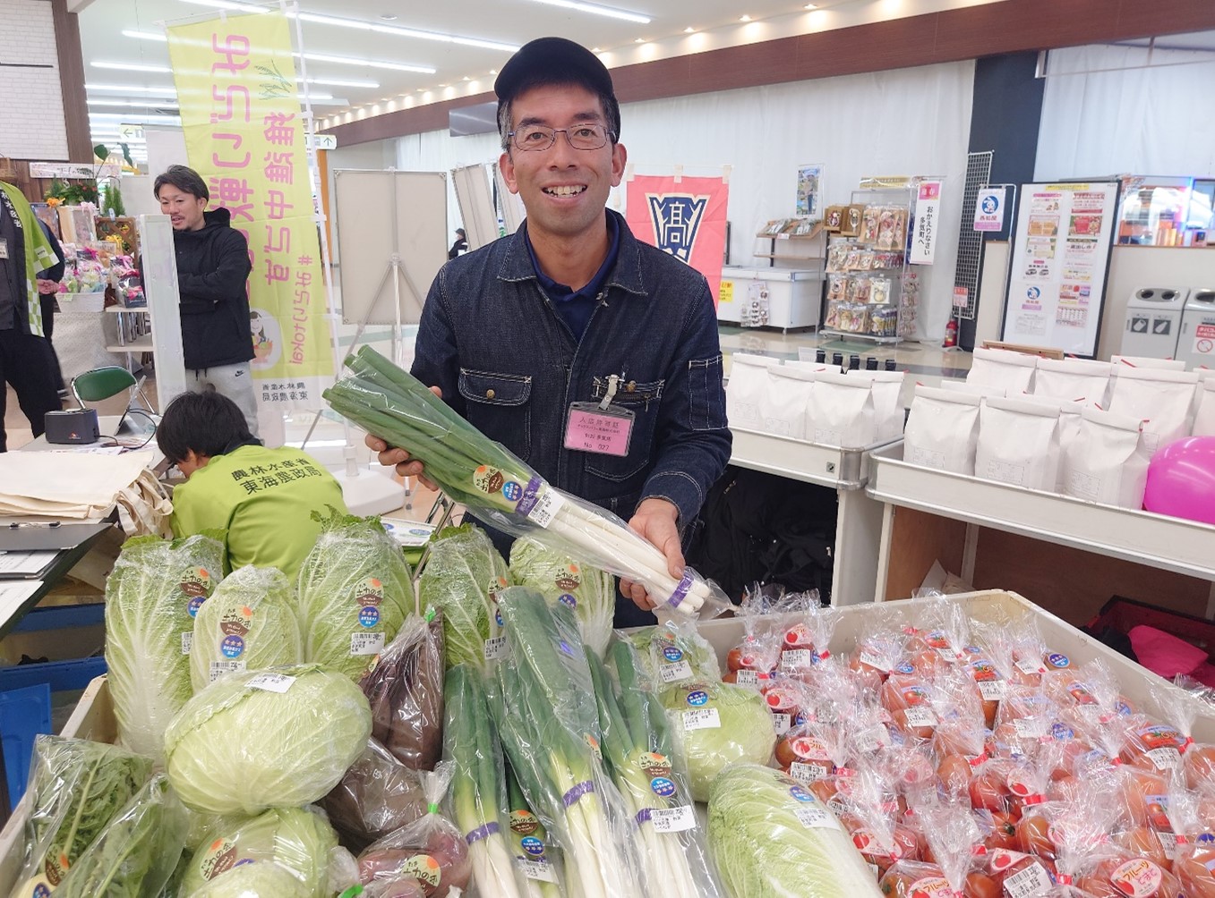 当日は、「みえるらべる」を取得した、地域の未利用資源(廃菌床等)を活用した堆肥を使用し、化学肥料を使用せず環境に配慮した栽培をするたき土力の会メンバーである、小川 忠康(おがわ ただやす)さん、北川 清生(きたがわ きよお)さん、スマイルファームさいだの齋田 英孝(さいだ ひでたか)さんの農産物や相可高校生の「恋するおこめ」等の販売が行われたほか、三重県拠点からは、野菜の摂取状況を人差し指で簡易計測できるベジメータの測定体験や「みえるらべる」のパネル展示およびチラシ配布等による周知を行いました。