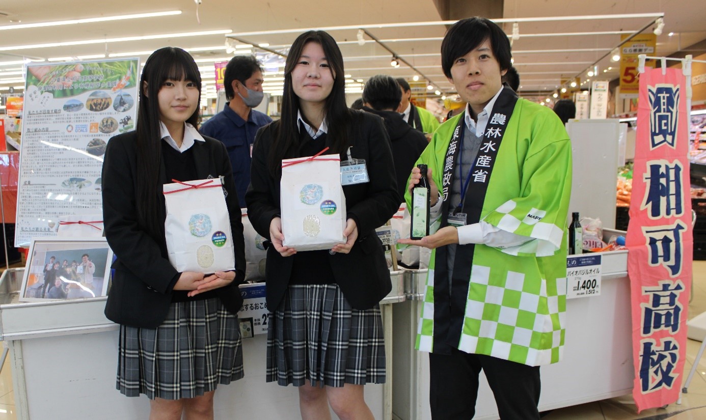 12月13日、三重県拠点は、「みえるらべる」(注)を取得した「たき土力(どりょく)の会」(三重県多気町)、「三重県立相可(おうか)高等学校」(多気町)と連携し、多気町のマックスバリュ多気店で、「みえるらべる」のPRイベントを昨年度に続き実施しました。