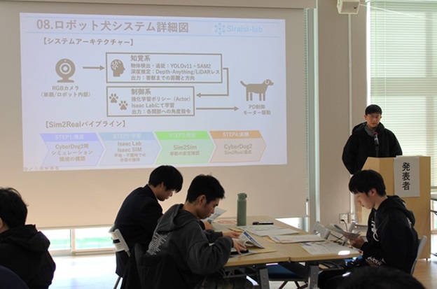 学生の研究発表では、鳥羽商船高等専門学校生による「ロボット犬を用いた完全自動害獣対策システム開発」「ノリ養殖を食害から守る『めたましーど』(追い払い機)の開発」「みかん栽培を変える生産と流通のシステム化『みかえる』の開発」に関する研究成果が発表されました。