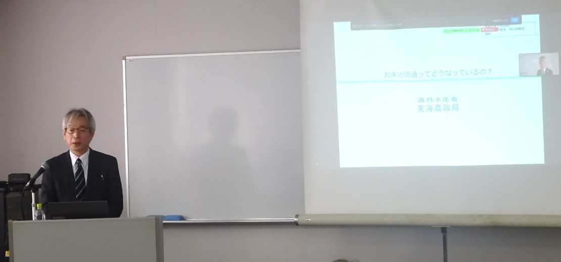 講演では「お米の生産から消費者に届くまでの流れ」「政府備蓄米の仕組み」「水稲収穫量調査」等について、動画を交え分かりやすく説明しました。