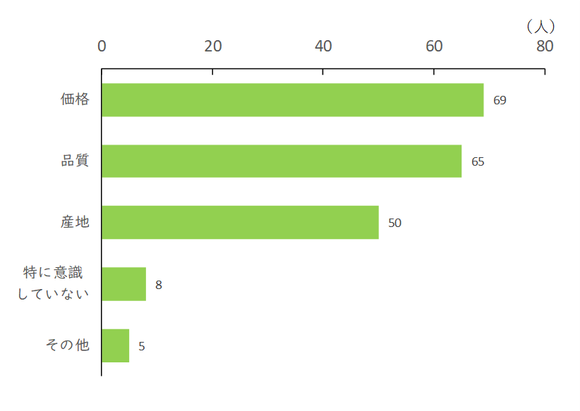 アンケートの「Q1.普段、何を基準に農産物を購入していますか」に対しては、「品質」との回答が最も多く、次いで「価格」「産地」の順となりました。