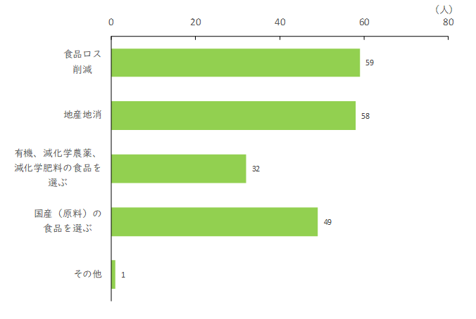 「Q2.普段、環境にやさしい取り組みを行っている、またはこれから取り組みたいと考えていることはありますか」では、「食品ロス削減」との回答が59人と最も多く、次いで「地産地消」「国産(原料)の食品を選ぶ」となりました。