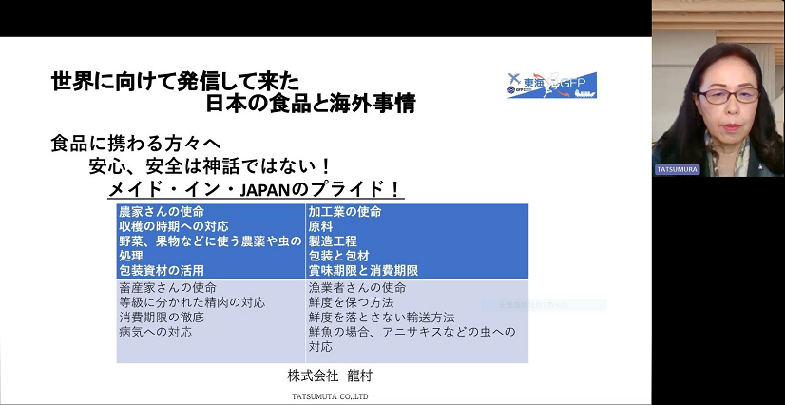 当セミナーでは、本年度セミナーのふりかえりとして東海GFP事務局の株式会社OKB総研が、「商社を知る~輸出商社活用のメリット~」をテーマに講演を行った後、中村 真里子 氏(株式会社龍村)から「世界に向けて発信して来た日本の食品と海外事情」をテーマに講演いただきました。