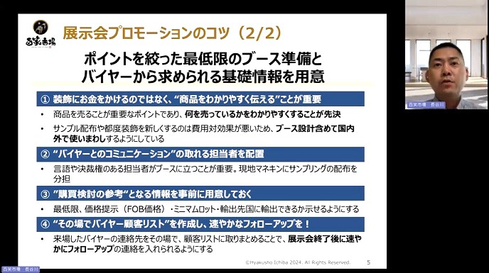 当セミナーでは、長谷川 有朋 氏(株式会社百笑市場)から、実体験を踏まえた国内展示商談会における工夫、注意点などを紹介いただきました。