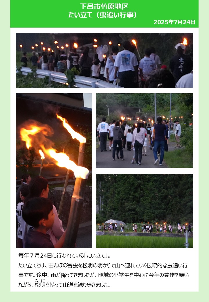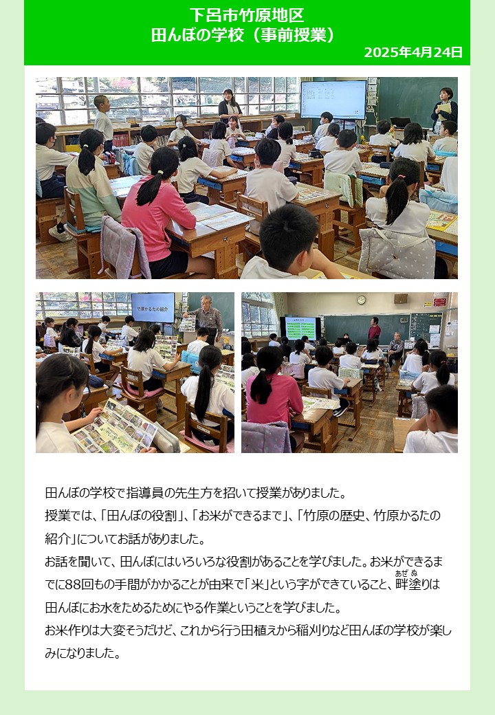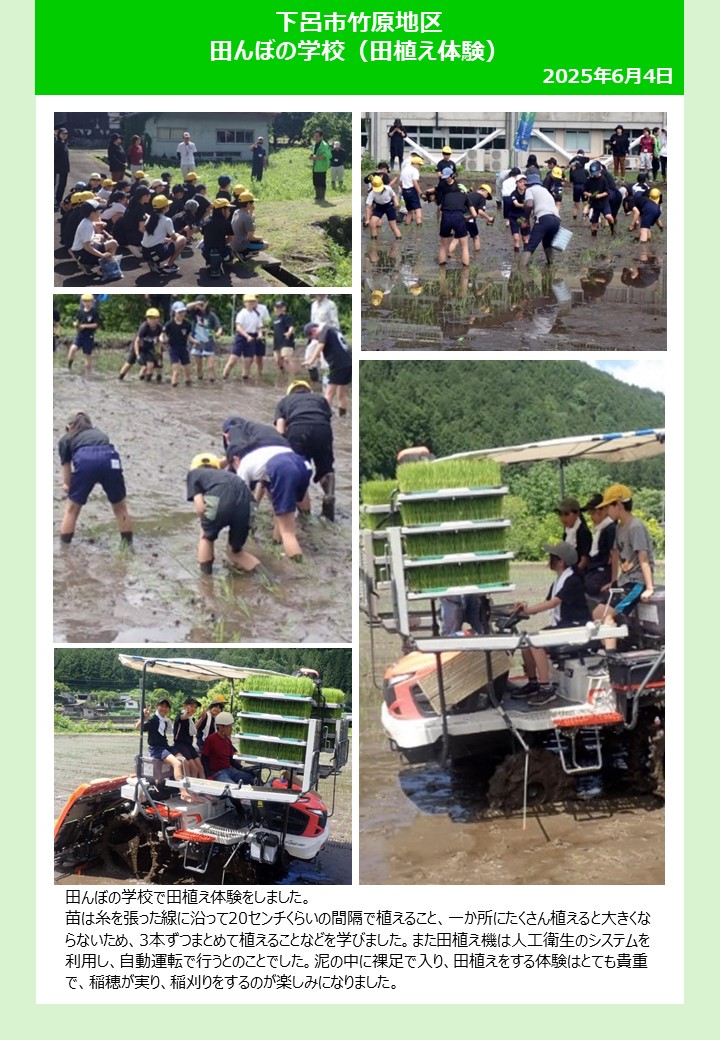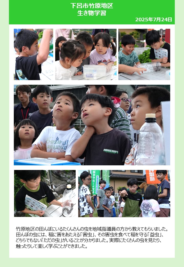 岐阜県下呂市竹原地区では、下呂市立竹原小学校5年生の生徒を中心に、地域自治会や益田川漁業協同組合、下呂市役所、下呂農林事務所等と連携し、農村資源に生息する多様な生き物調査や田植え、稲刈りなどの農業体験をする「田んぼの学校」を行っています。また、隣接する益田川に生息する水生昆虫の観察や稚魚の放流、つかみ取り体験、自分たちで育てたお米やつかみどりした魚を調理し食べるなどの農林漁業体験を通して食育の推進を行っています。